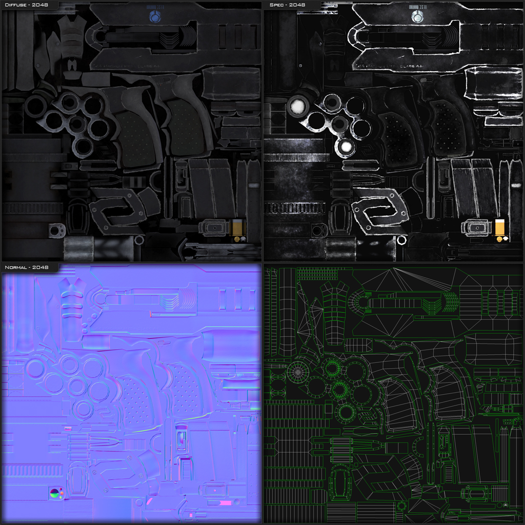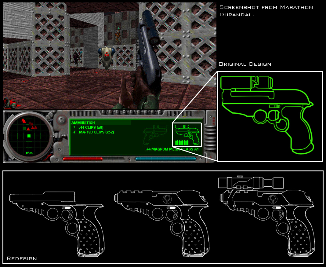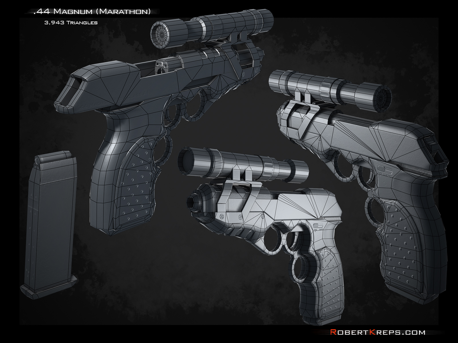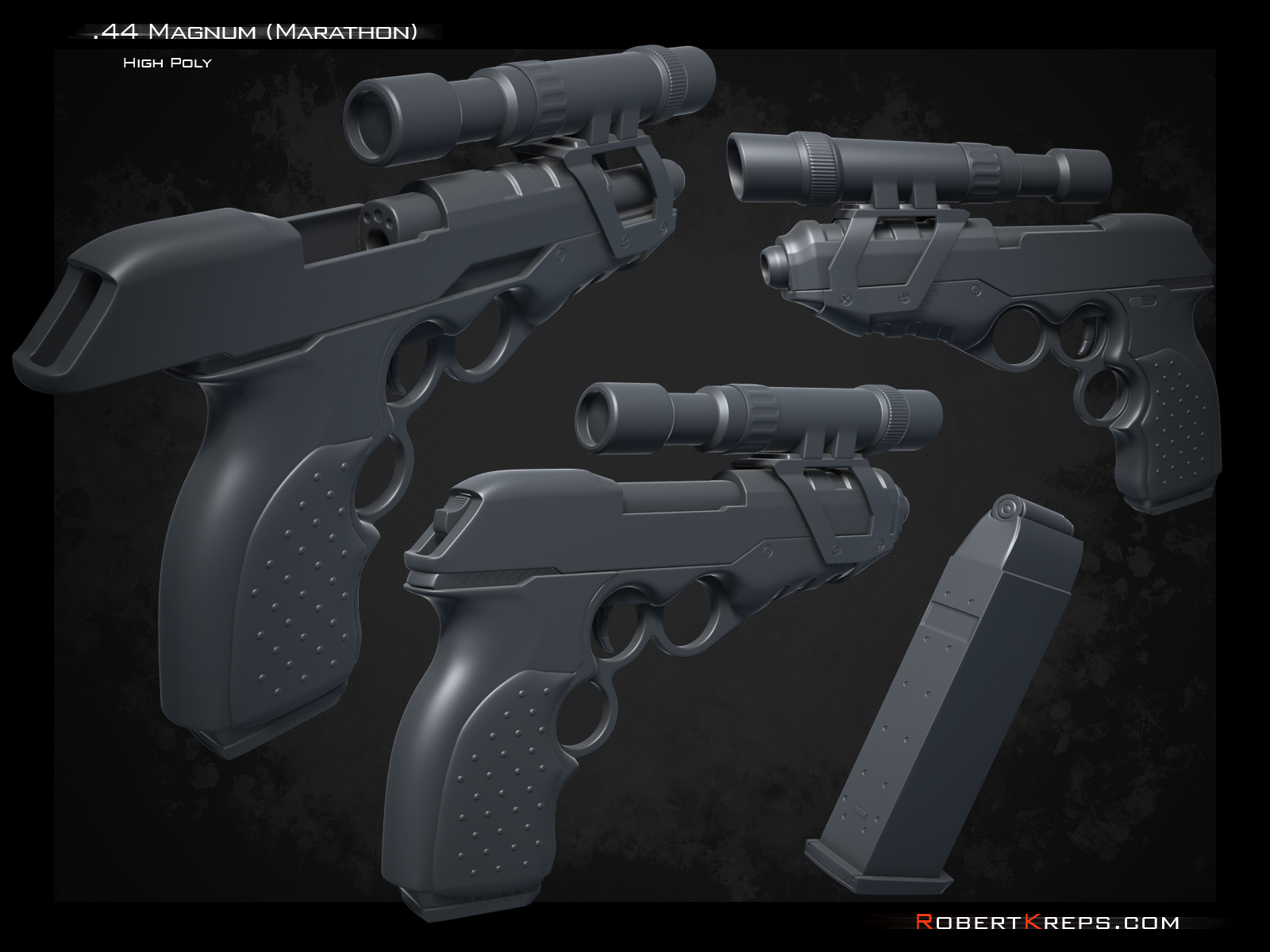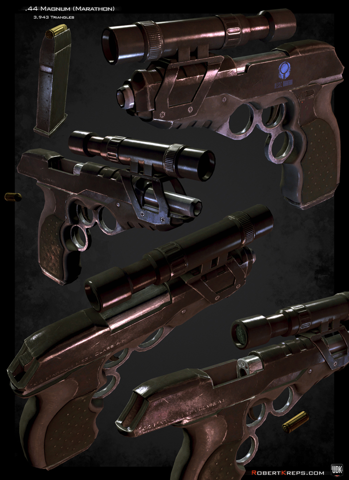 Made with 3ds Max, Photoshop and Crazy Bump. This weapon is a redesigned version of the .44 Magnum from Bungie's classic shooter Marathon. This was the first weapon that I created that was based on my own conceptual designs as opposed to real life reference. This model became a fully functional weapon inside of the UDK, including first person animations.