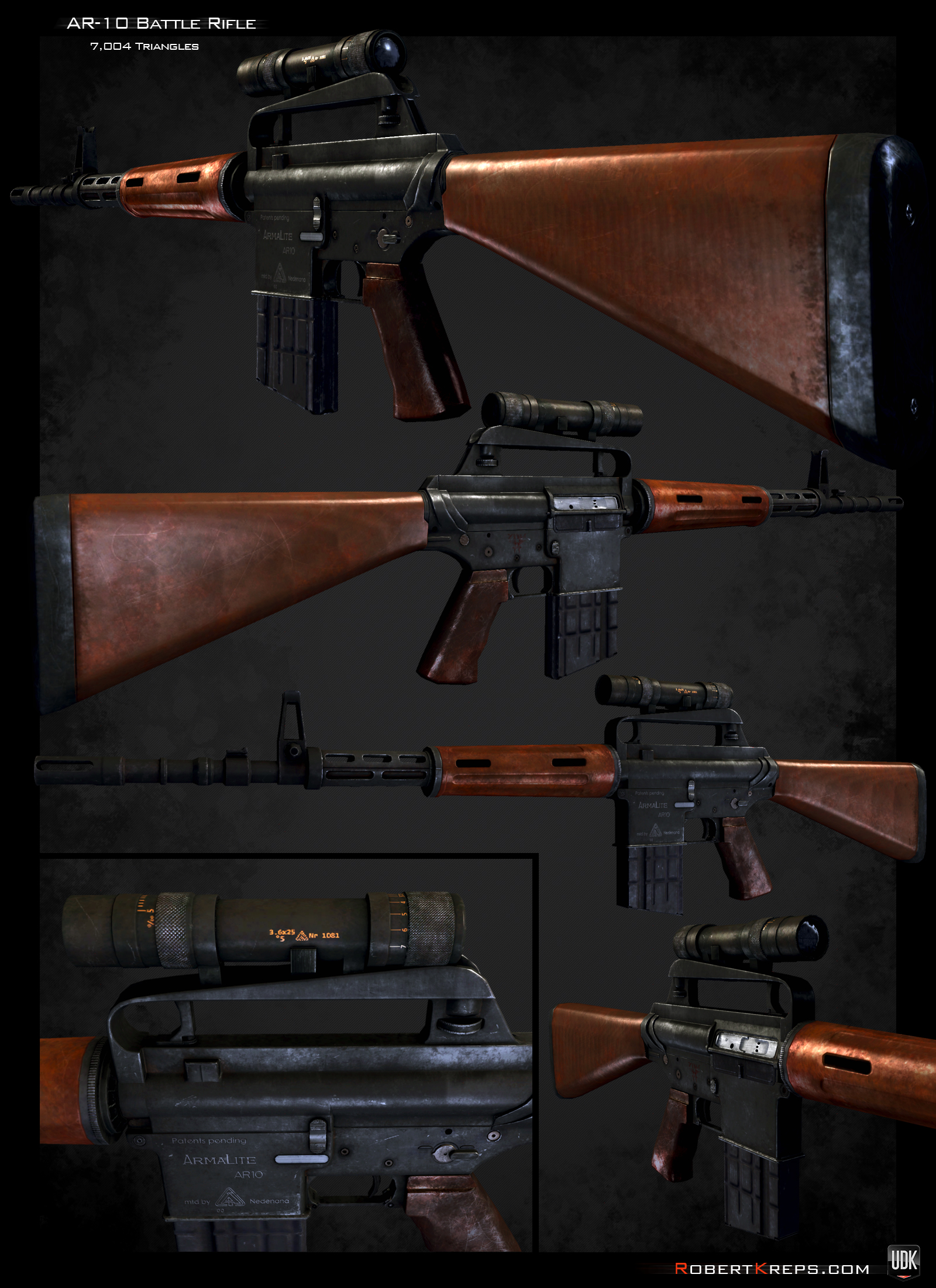 Created with 3ds Max, Photoshop and Crazy Bump over the course of about 3 weeks. This rifle was a real learning experience for me. It was the first real complex object that I tackled with Sub-D modeling. It was my goal to push my skills as far as I could to make it as faithful to the reference as possible.